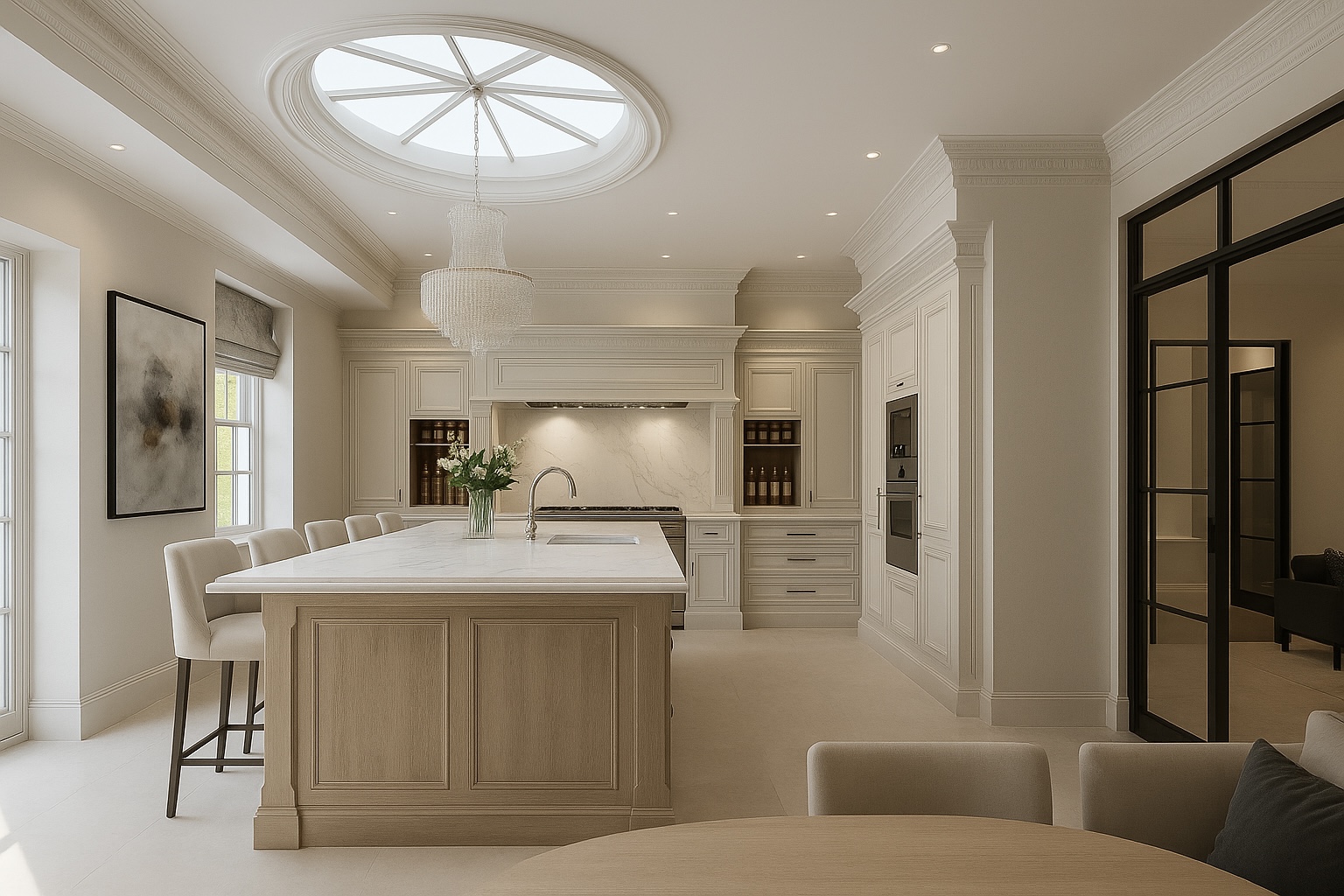 Set in a castle on the outskirts of Edinburgh, this kitchen and family lounge formed part of a full structural remodel designed to suit modern family life and effortless entertaining. A dramatic quartzite island anchors the space beneath a spectacular glazed dome, while the Officine Gullo range cooker, handcrafted in Tuscany, brings timeless elegance. A dedicated wine bar in the lounge area ensures the space is refined, functional, and ready for gatherings of any scale.